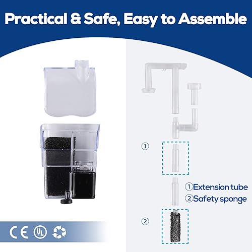 【How to Use Laqual Filter】The filter is suitable for a 2-7 gallon fish tank. 1. Before each restart, make sure the filter basket water level is above 50%. Before the first use, we recommend filling the filter basket with water. 2. Fish tank water level must be above the water inlet of the surface skimmer. 3. The maximum water intake is 80gal (300L) / h. Two extension tubes can be adapted to different water levels. Please feel free to message us if there is any problem during use.