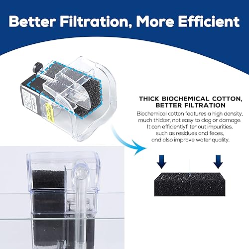 【Efficient Filtration & Surface Skimmer, Clean Home for Your Fish】With the scientific structure, the pump is very powerful and energy-saving. Biochemical cotton features a high density, much thicker, not easy to clog or damage. It can efficiently filter out impurities, such as residues and feces, and also improve water quality. The unique surface skimmer can effectively remove the scum, so you'll never struggle with how to remove it. Come and give your lovely fish a clean and comfortable home!