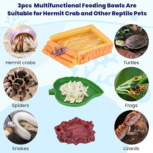 【Safe, sturdy and durable material】The yellow hermit crab bathing pool and red hermit crab water bowl are made of safe resin material. The green leaf feeding dish is made of high quality plastic material. Both are made of safe, durable and unbreakable material which is no harm for the reptile pet and is very easy to be clean