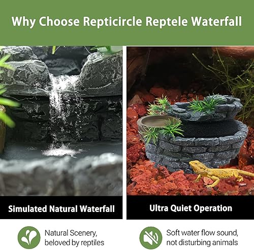 Simulated Natural Reptile Waterfall: The Repticircle Reptile Water Fountain with Food Dish mimics a natural waterfall, creating a lifelike environment that encourages reptiles like bearded dragon, gecko, and chameleon to hydrate and enjoy their space in reptile tanks