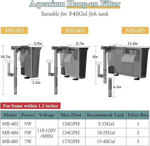 VILLNO 124GPH adjustable fish tank filter, can be used in 5-15gallons fish tank, turtle tank. Suitable for frameless fish tanks and fish tanks with frame within 1.2in. 5W powerful aquarium filter with large filter box is equipped with 1 filter sponge and 1 bag of activated carbon. Very easy to clean the box and you can also DIY other filtering materials to achieve better filtering efficiency.