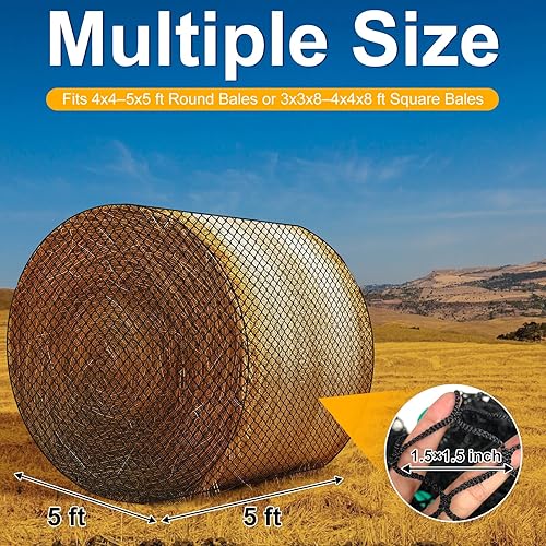 Multiple Size: This round bale hay net can accommodate 4x4 to 5x5-foot round bales or 3x3x8 to 4x4x8-foot square bales. It is ideal for feeding hay, alfalfa, and corn stalks. It is suitable for horses, cattle, goats, and sheep in any pasture or barn