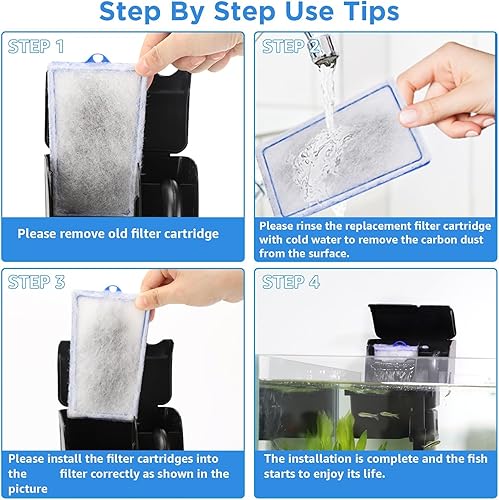 【4 in 1 Fish Filter Cartridges, 360° Filtration, Keep Aquarium Fresh and Fish Healthier】: ① Fish tank filter cartridge is wrapped by dense double-sided mesh to capture maximum debris and filter debris and fish waste. ② Super activated carbon quickly removes odors and yellow, leaving the glass of your aquarium free of buildup and keeping the fish tank's water crystal. ③ NEW aquarium filter media Zeo-lite, work to keep PH balance of the water while also removing odors and discolorations.