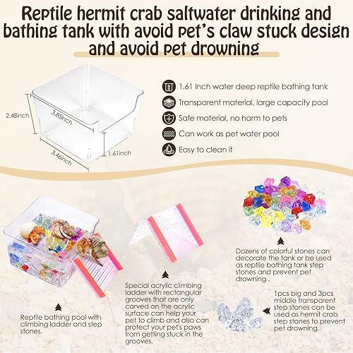 【Terrarium hermit crab play pool,drinking and food usage purpose】The transparent hermit crab water tank with red climbing ladder combined with our colorful steps stones can prevent the reptile hermit crab pet from drowning in play pool.The red resin rock-like fresh water drinking bowl can be used for reptiles to drink fresh water, The black rock-like food bowl can be used for hermit crabs to feed