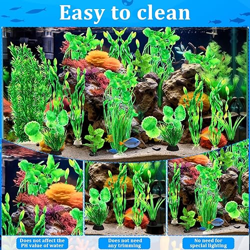 Easy to Clean: these aquarium decor plastic plants require no lighting, fertilizer, or pruning, ensuring a vibrant color that lasts; The smooth surface, which doesn't easily hold algae, lets stains come off with a simple rinse, saving time and effort for busy fish keepers