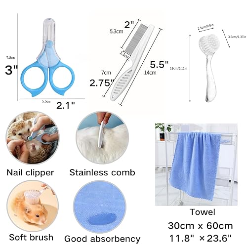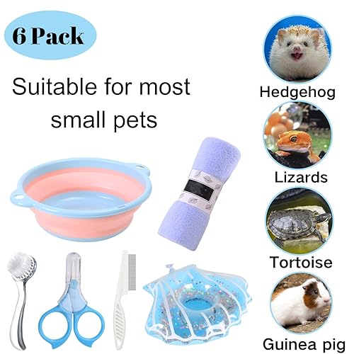 Comprehensive Hedgehog Bath Supplies Kit: 1 x Foldable Hedgehog Bathtub (12.6" x 9.8" x 3.5"). 1 x Hair comb(5.5" x 0.98"). 1 x Small Animal Clippers (3" x 2"). 1 x Bathing Brush( 5.1" x 2.5"), 1 x Towel(11.8" x 23.6"), providing everything you need to keep your beloved hedgehog clean and groomed