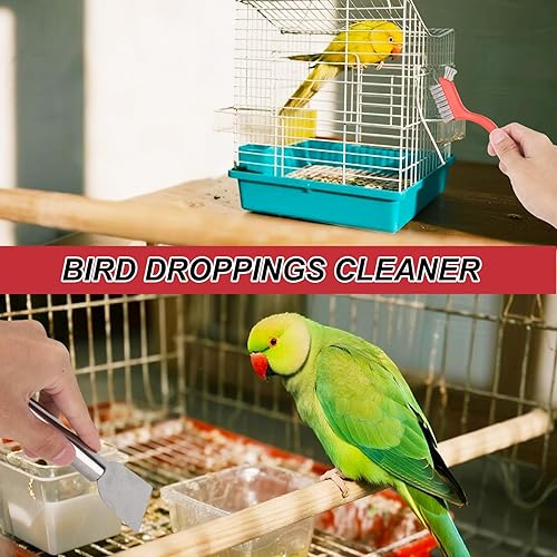 Practical Tools: These brushes remove dirt, the fork helps clear out debris, the scraper effectively removes hardened droppings, and the broom easily sweep up waste and spilled food inside the cage. Simple and efficient, a must-have for bird cage cleaning.