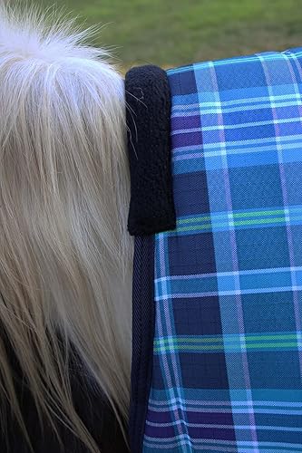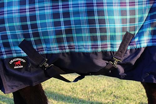 Challenger navy green plaid medium-weight horse blanket features a windproof, waterproof, and breathable durable 600D outer shell constructed with ripstop weave fabric.