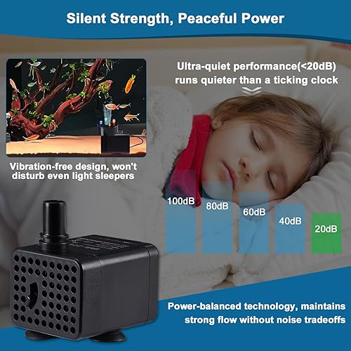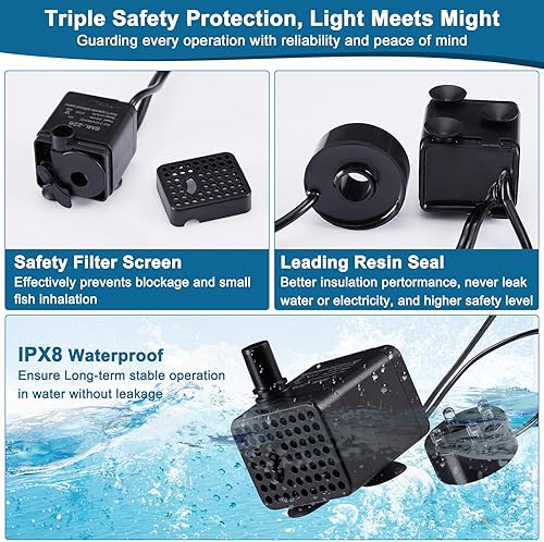 ULTRA-SAFE, PLUG AND PLAY, WIDE APPLICATION: Fish-safe aquarium pump with clog-proof design! Its fine mesh filter blocks debris while protecting small fish, and the leak-proof resin seal ensures worry-free operation. Versatile submersible water pump with 3 suction cups for horizontal/vertical mounting. High-efficiency design perfect for aquariums, ponds, fountains, hydroponics, and pet water systems.
