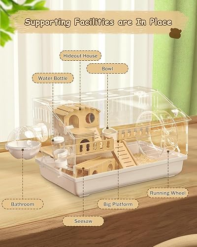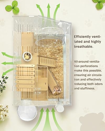 Complete Accessories: Includes a European-style wooden hideout, food bowl, stairs, 18cm silent running wheel, seesaw toy, external bathing area, and a leak-proof water bottle. Provides ample space for digging and playing
