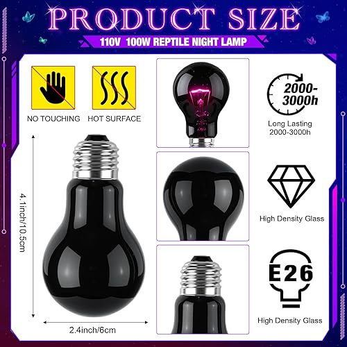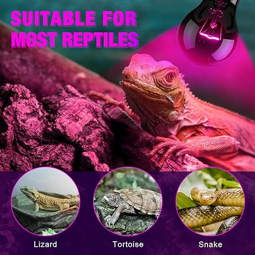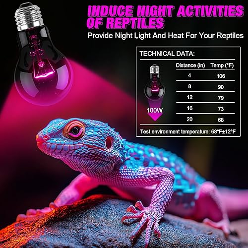 Reptile Health: moonlight bulbs increase the overall temperature of the reptile cage, providing a warm environment for your pet; This heated luminaire has a purple-coated surface that emits soft light without disturbing a night's rest
