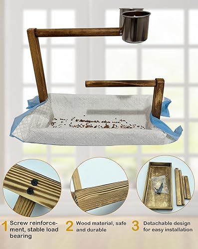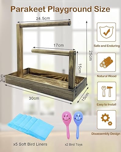 Natural Materials: Bird perch stand training made of natural wood and connected with screws. Providing a safe and sturdy platform for your birds to explore and play. The package also contains 5 Pcs disposable urine pads and 2 x small toys for birds