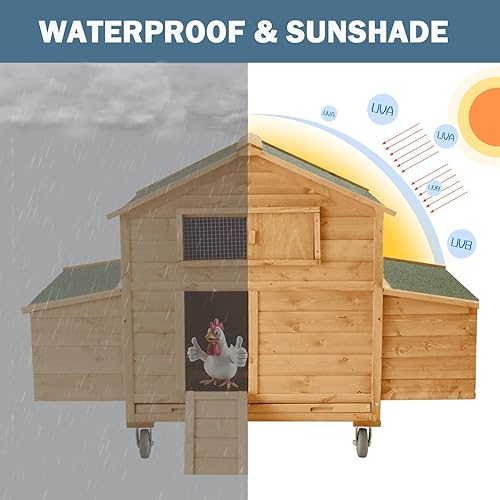 【Asphalt Roof & Waterproof PVC Cover】The chicken coop with run is fully covered with asphalt roof (Avoid wood roofs absorbing water and rotting). We also add a PVC waterproofing strip to the asphalt drips, ensuring that the coop will not leak rain