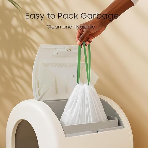 Drawstring Design: Features a self-sealing double drawcord for quick litter changes and instant odor lock. No-contact disposal—simply pull open the drawer, lift and tie the bag, then close and discard