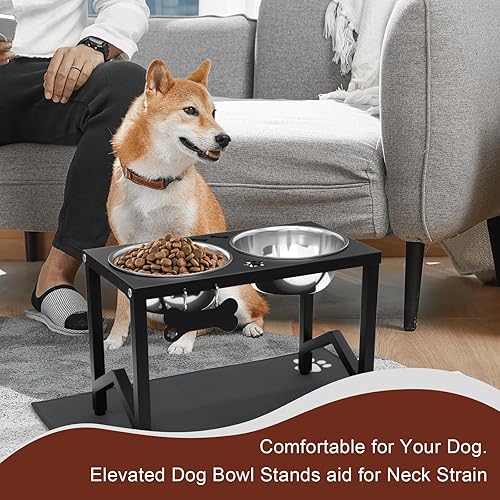 • [ Non-Slip Base & Splash-Proof Mat Included ] The sturdy metal frame has anti-slip feet and can be adjusted to adapt to uneven ground, preventing the raised dog food bowl rack from shaking. The included mat can prevent spilled water and food, no more messy floors—just a secure, dog bowls elevated setup for your pet
