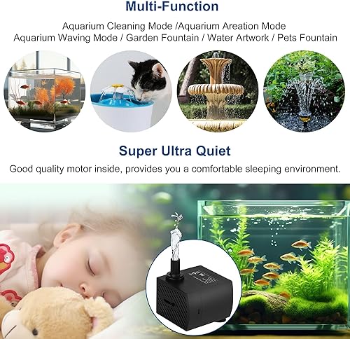 Submerged Design: Must be fully submerged to function properly, the pump comes with 3 suction cups,2 Nozzles ( 8mm 13mm) for versatile installation options and a 6.5ft long waterproof power cord.