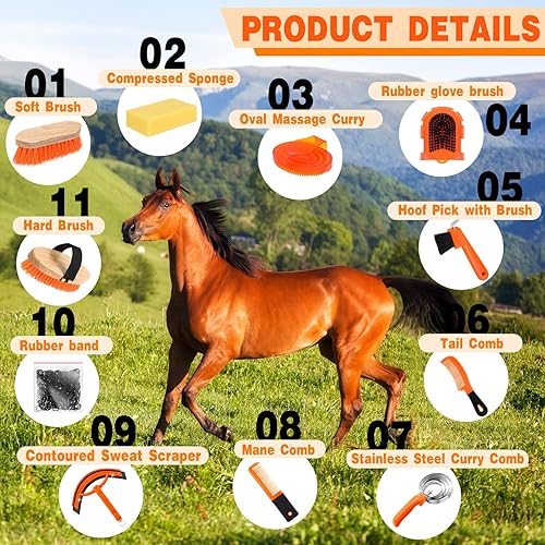 Horse Grooming Kit: this horse grooming set includes storage bag, oval massage brush, hard brush, soft brush, sweat scraper, bath sponge, hoof pick with brush, mane comb, tail comb, rubber band, etc., a total of 12 pieces, such a nice and complete grooming set can satisfy your needs for grooming your horse