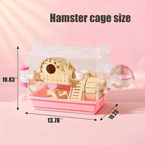 1.Complete Accessories – Our acrylic hamster cage is designed to meet all your pet care needs. The set includes: an acrylic transparent hamster cage, a wooden snail-shaped hideout, an arch bridge, a 13 cm exercise wheel, a staircase, food bowls, an external bathing area, and an 80 ml water bottle. No additional purchases are required.
