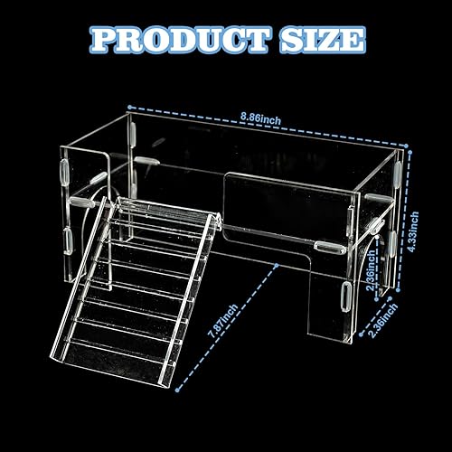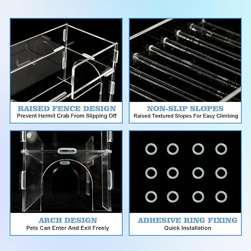 L-Shaped Platform Design: Smooth acrylic protects the skin of geckos and the shell of hermit crabs. The protrusion of stairs can prevent slipping while climbing. The raised fence design on the second level can prevent pets from falling off. On both sides of the first floor, there are arches where hermit crabs can freely enter and exit.