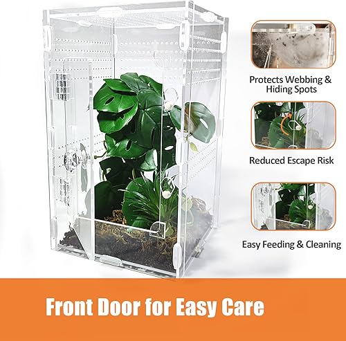 Front-Opening Design: The front door provides easy access for feeding and maintenance without disturbing any webs your jumping spider may have spun at the top