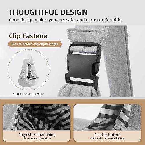 【Safety Design】:The dog bag is designed with an adjustable safety hook which links to your pet's collar, to prevent the dog from accidentally falling off. The opening of the puppy sling holder has a safety buckle to prevent the puppy from jumping out mischievously.
