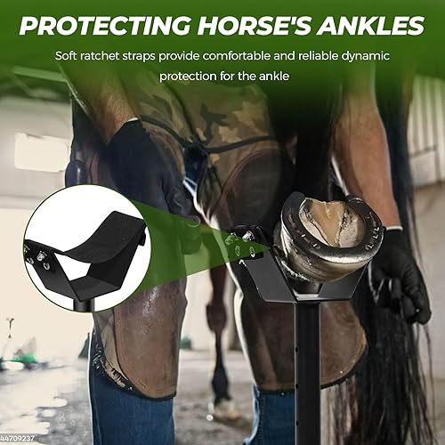 Flexible Adjustment: The height of the hoof stand can be adjusted from 16 to 24 inches to adapt to your optimal working height and improve the work efficiency of veterinarians or hoof trainers. The top soft ratchet strap with adjustable tension provides comfortable and reliable dynamic protection for the horse's ankles, and is the basic support equipment for horse care.
