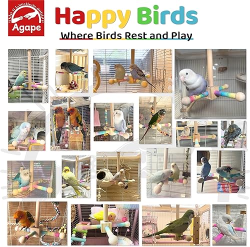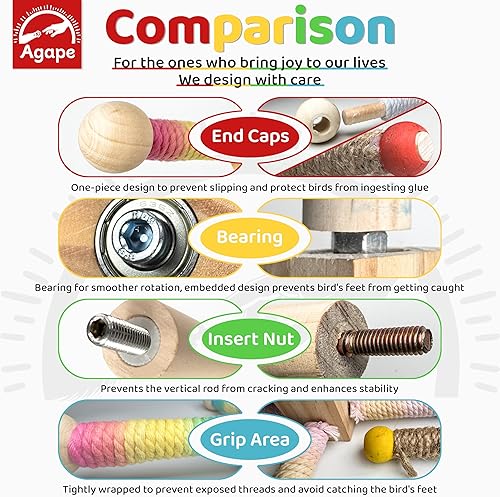 【Material+】The stand perch is wrapped with soft, durable cotton rope, providing a comfortable and secure grip for your bird. The center block is made of softer pine wood, ideal for parrots to chew and trim their beaks. Additionally, the reinforced insert nut helps prevent the wooden bars from cracking, ensuring long-lasting durability