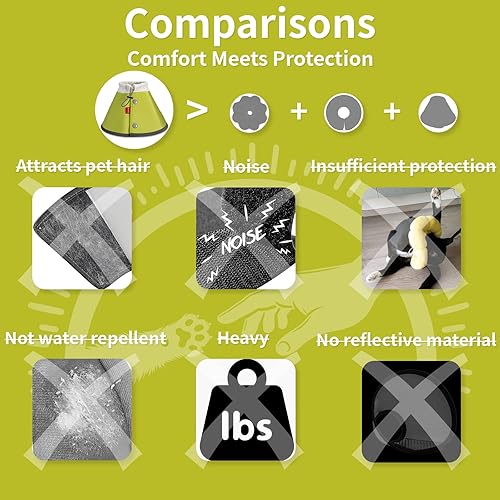 【Soft & Lightweight】 Crafted with internal EVA material and Rib Fabric, our cone collar weighs just 1.9 ounces—lighter than the weight of an egg. This lightweight design ensures dogs sleep comfortably without feeling burdened or restricted around their necks. Plus, the soft cone collar provides excellent rebound near walls or furniture, ensuring your pet's safety without emitting loud noises
