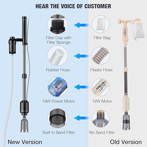 UPGRADED 18W MOTOR WITH STRONG SUCTION: Equipped with upgraded18w powerful pump motor, the fish tank vacuum has stronger suction capacity while working. It not only helps you change the water and add water quickly and time-saving, but also makes it more thorough while suck up dirt or impurities in the fish tank. Our pump motor is mounted in the end position and you can use it to clean low water tanks. (The sand wash start must be above 15cm)