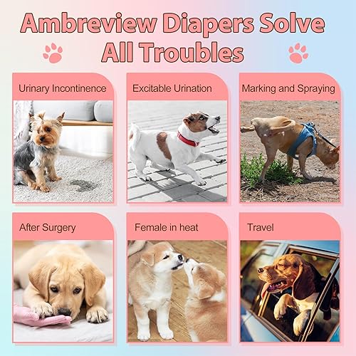 【Elastic with Full Wrap Diaper】Ambreview stretchy diapers are pulled up, not velcro, easy to put on and take off, not too tight and not too loose. Tested by a large number of buyers, this elastic dog pull up diaper is more suitable for dog's body shape, it can keep good condition after sports, and the diaper with elastic waist will not fall down!Recommended for puppies/small dogs/mid-sized dogs to ensure results, somewhat difficult to use on extra large dogs!