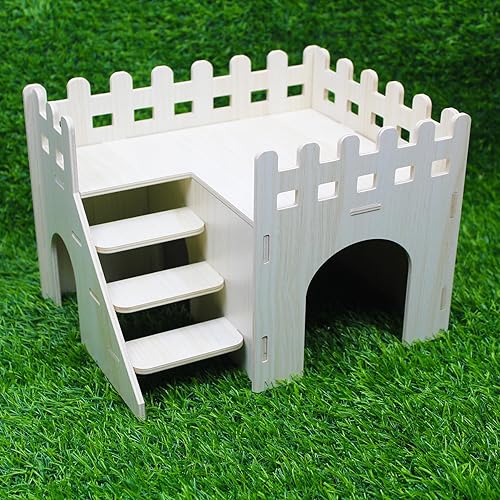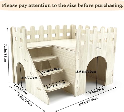 【Well-Made and Unique Design】 The wooden hamster hideout has a clean burr-free cut surface and every corner is polished smooth. The wide ladder and roof are freely to climb and play for small animals, the door opening is also large enough for small animals to enter and exit freely.