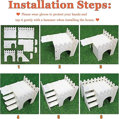 【Easy to Assembly】This hamster hideout house needs to be assembled, and the installation steps are shown in the pictures. When it is not needed, you can take them apart and store it in a proper place. Please rest assured that it is very simple and convenient. The wood hamster hideout provides a safe harbor for your small animal with lookout. It's a warm home for pets.