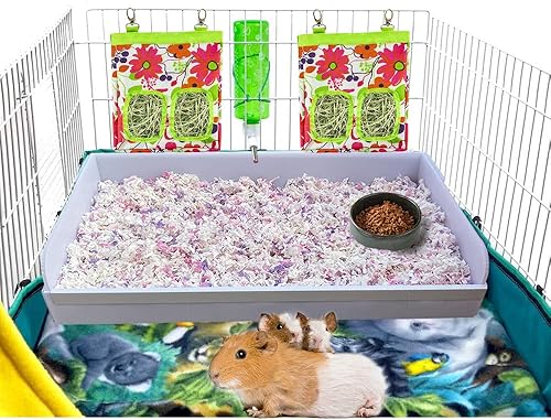 Our guinea pig kitchen area is large enough. You can put in disposable bedding, nice hay or shavings. You can still place food bowls, water bottles and fleece in the rest of the cage. Such a combination will make your pig house look neater.