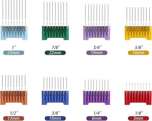 Red(1/8" 3MM), Dark Purple(1/4" 6MM), Dark Blue(3/8" 10MM), Peach(1/2" 13MM),Yellow( 5/8" 16MM),Light Purple(3/4" 19MM), Green(7/8" 22MM).Light Blue(1" 25MM)