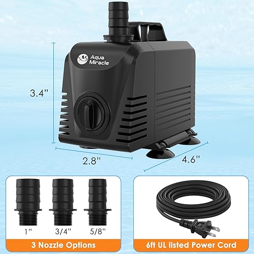 PERFORMANCE – This fountain pump is energy efficient with permanent magnet rotor and specially designed impeller. Pre-filtration foam in the front housing to prevent debris from entering the aquarium pump so as to protect the impeller. Max Flow 1160GPH (4400L/H), Max lift 11.5ft (3.5m), Power 50Watt.