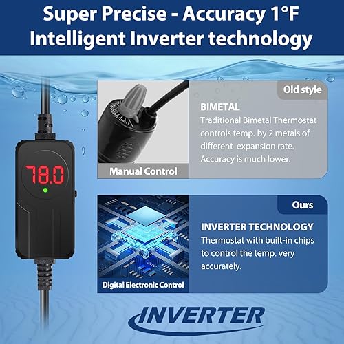 ACCURATE TEMPERATURE - Thanks to the intelligent inverter technology, with the in-built chips the thermostat keeps the aquarium heater at a constant temperature at an accuracy of 1F, much more accurate than the traditional knob-controlled fish heaters. The thermostat shows 2 readings – the current temperature and the set temperature – very easy to operate.