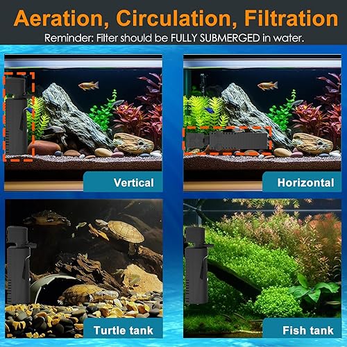 PERFORMANCE - Power 3.5W, Max. Flow 130GPH, Max Lift 2.5ft. This aquarium filter fits tanks 10-40 Gallons. It not only cleans green water but also enhances oxygenation and circulation in your tank.