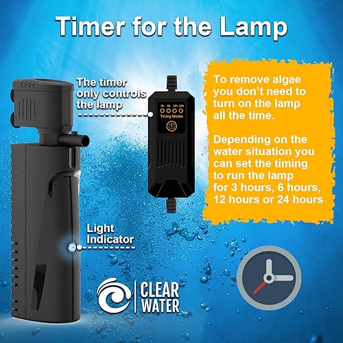 U - V LIGHT WITH TIMER - Equipped with a 5W U - V light to take care of green water, keeping your aquarium water sparkling clean. And, it’s got a timer feature, with options for 3/6/12/24 hours. You can set up the lamp to work different shifts according to your needs. Note: The timer is only for controlling the light, not for the pump.