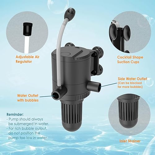 AERATION - This fish tank powerhead pump includes air tubing and an air venturi to increase the oxygen levels in your aquarium. To ensure sufficient oxygen, plug the side outlet and avoid placing the pump too deep in the water.