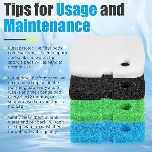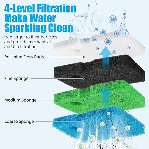 4 pcs of sponge bio filter pads (1xCoarse, 2xMedium, 1xFine): trap most visible debris particles without restricting water flow (Reusable after rinsed)