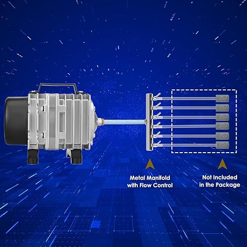 ACCESSORIES – A short piece of hose and a 6-outlet volume adjustable metal manifold are included in the package of this pond aerator to facilitate the application. Users only need to buy 3/16” standard airline tubing and air stones to start the operation.