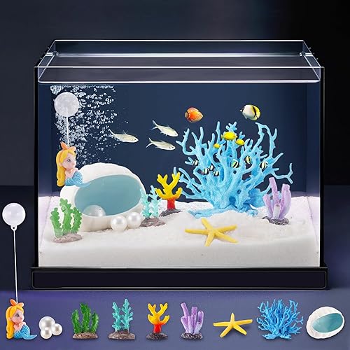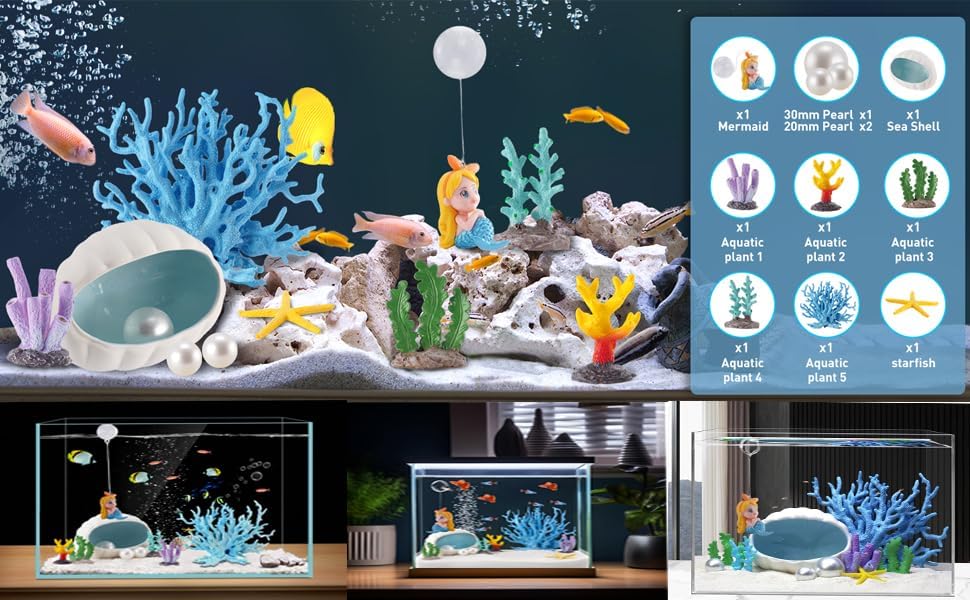 Integrates a variety of accessories including corals, starfish, shells with pearls, and mermaid figurines. With just one set, effortlessly create a rich underwater ambiance, adding more layers and visual impact to your aquarium.