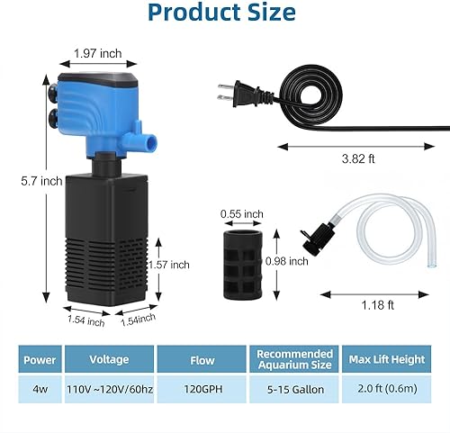 【Perfect Multifunctional System】: DaToo fish filters for aquariums combines water circulation, oxygenation, wave making and filtration functions in one, perfect fit for 5-15 gallon tanks. Its low power consumption of 4W can provide strong traffic of up to 120GPH, circulating water 4-6 times/hour. significantly improve the fluidity of the water body, keep the water quality clean and transparent, so that your fishes will grow up healthily in the oxygen-enriched and clean water environment.