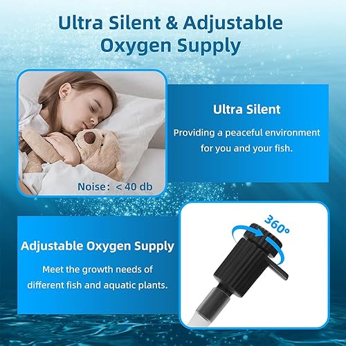 【Ultra Silent & Adjustable Oxygen Supply】: DaToo small aquarium filter utilizes advanced noise reduction technology , operating at a mere 40 decibels, providing a peaceful environment for you and your fish. Equipped with an air adjustment knob, you can easily adjust the airflow volume and airflow strength to control the oxygen supply and oxygen content of the water to meet the growth needs of different fish and aquatic plants, ensuring that your aquarium operates both quietly and efficiently.