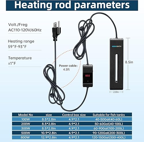 200W aquarium heater-This 200W aquarium heater Suitable for 40-50Gal aquariums, Common for fresh and sea. waterThe heater is 8.2 inches long, Voltage 110-120VPlease, choose the heater for fish tank that suits you according to the size.