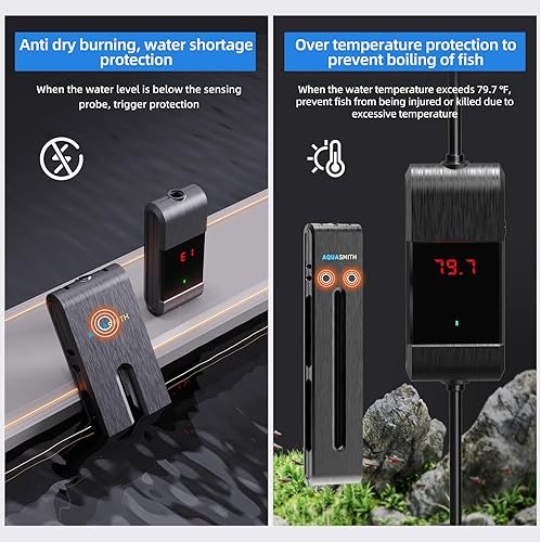 multiple protections 1: fish tank heater has two IPS intelligent temperature control chips. When one fails, the other automatically takes over. 2: Equipped with three probe sensors, Automatic power off from water, to prevent over-warming and dry boiling. 3: IPS anti-boiling fish, when the heating rod is detected to be out of control, IPS automatically starts and cuts off the power supply within. 4: When an abnormal situation occurs, the controller will alarm and display the error code.