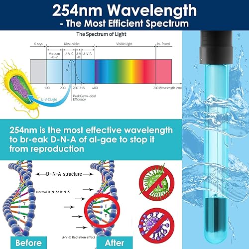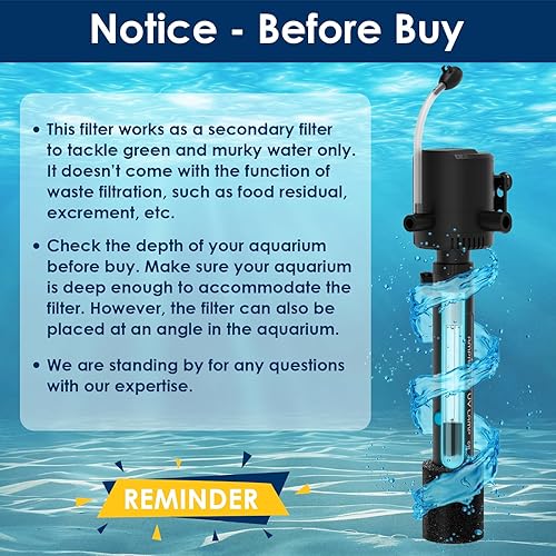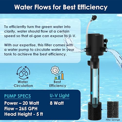 Efficient Cleaning – The fish tank filter is equipped with a 6W U-V lamp (254nm wavelength) to effectively eliminate green al-gae blooms, turning murky cloudy green water into crystal-clear clarity and removing odors