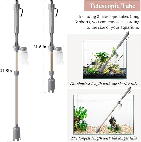 【Multi-Functional Design】:Functions as a gravel cleaner, water changer, and sand washer in one tool, making it an all-in-one fish tank cleaning solution for aquarium owners who want efficiency and convenience, The adjustable length of this water changer is 21.6-31.5 inch, suitable for aquariums of various sizes