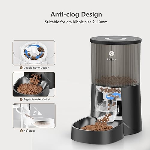 Anti-Clogging Design: Double rotor design ensures even food distribution; food passage features a wide-angle and 40-degree slope to speed up grain flow; recommended for dry kibble sizes between 0.07 to 0.4 inches