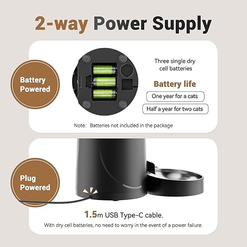 Dual Power Supply: Never worry about power outages again. This pet feeder is equipped with a dual power supply system, and supports AC power and batteries(Not included) as backup, Even if there is a power outage, the pet feeder can still continue to work with the battery to ensure that your pets can eat on time